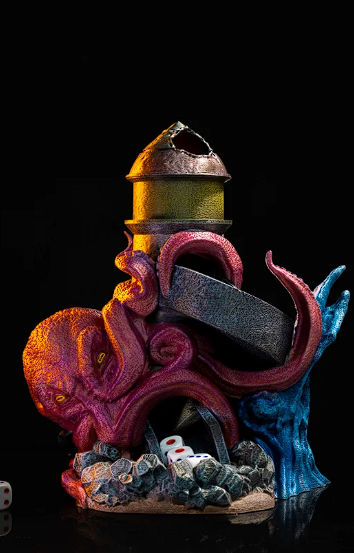 - The Kraken's Lair: Dive into the depths of the oceanic abyss with the awe-inspiring "Kraken's Lair" dice tower. This extraordinary creation captures the terrifying power and mythical allure of the legendary sea monster, the Kraken. Crafted with intricate details, this dice tower showcases the Kraken's enormous tentacles emerging from turbulent waters, ready to ensnare your dice in its grasp.